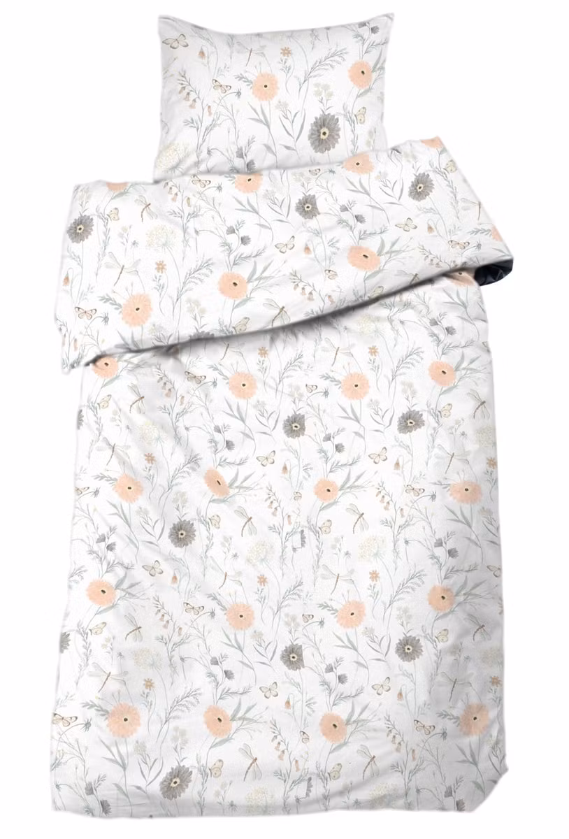 Det blommiga mönstret är detaljrikt men balanserat och ger sängen ett mjukt, romantiskt och inbjudande uttryck. Persikatonerna bidrar med värme medan de grå nyanserna skapar en stilren kontrast. Tillsammans med de gröna bladen och fjärilarna får bäddsetet ett naturligt och levande utseende som passar lika bra i moderna som i klassiska sovrum.