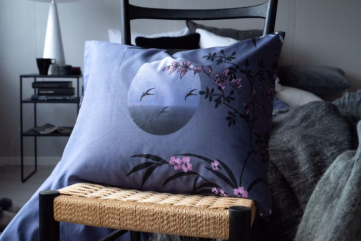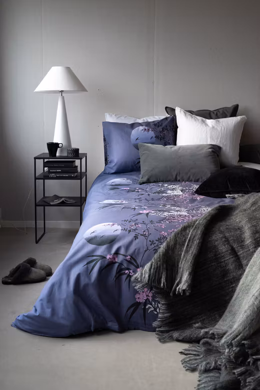 Skapa en drömlik och rogivande stämning i sovrummet med Japan Grå bäddset från Borganäs of Sweden. Mönstret är inspirerat av Japans vackra natur, med detaljerade japanska blommor i vitt och lilarosa och en drömlik måne i bakgrunden. Den grå bottenfärgen med lila undertoner ger en mjuk och elegant känsla som passar perfekt för dig som vill ha ett mer harmoniskt och estetiskt uttryck i ditt sovrum.