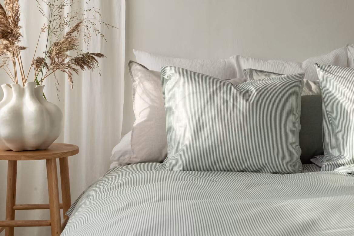Thelma Stripe Grön kännetecknas av sin tidlösa randiga design som ger sovrummet ett rent och balanserat helhetsintryck. De lodräta ränderna skapar ett elegant uttryck och bidrar till en känsla av rymd, samtidigt som färgkombinationen i grönt och vitt ger ett friskt och naturnära intryck.