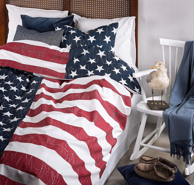 Påslakanet pryds av hela den amerikanska flaggan, medan örngottet har stjärnorna på ena sidan och ränderna på den andra – ett kreativt och genomtänkt mönster som ger en snygg kontrast och dynamik till sängens utseende.